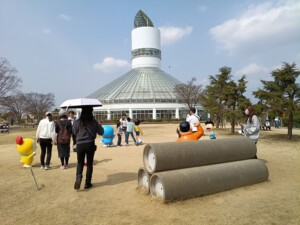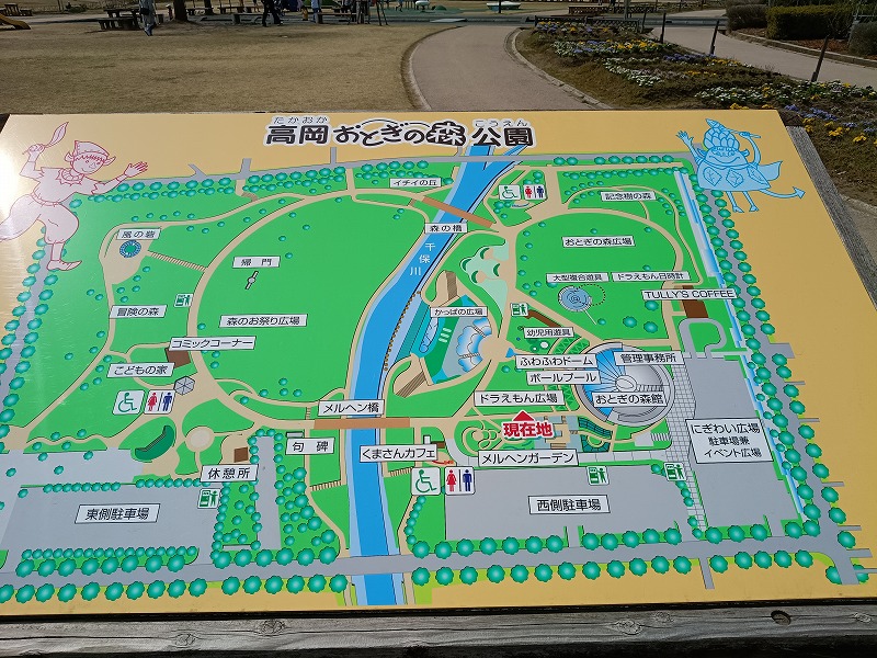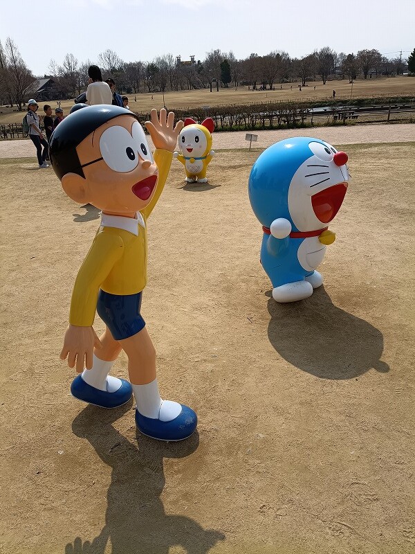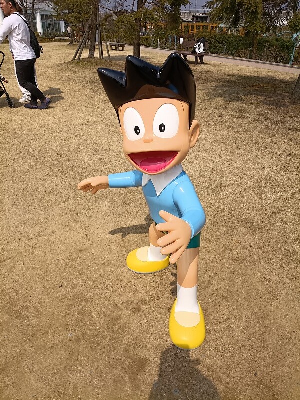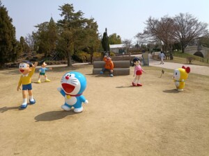 「ドラえもん」の登場人物のキャラクター像がある公園。展望台と花壇もあり、とても広い公園でした。